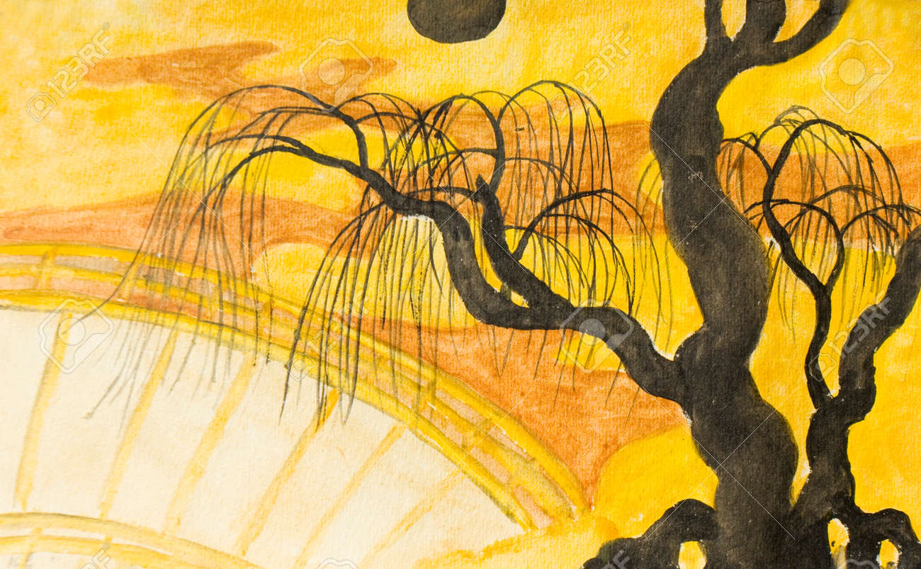 Handgemaltes Bild Aquarelle Landschaft Mit Schwarzen Baum Mond Und Brucke Auf Gelbem Hintergrund In Traditionen Der Alten Traditionellen Japanischen Malerei Lizenzfreie Fotos Bilder Und Stock Fotografie Image 43991017