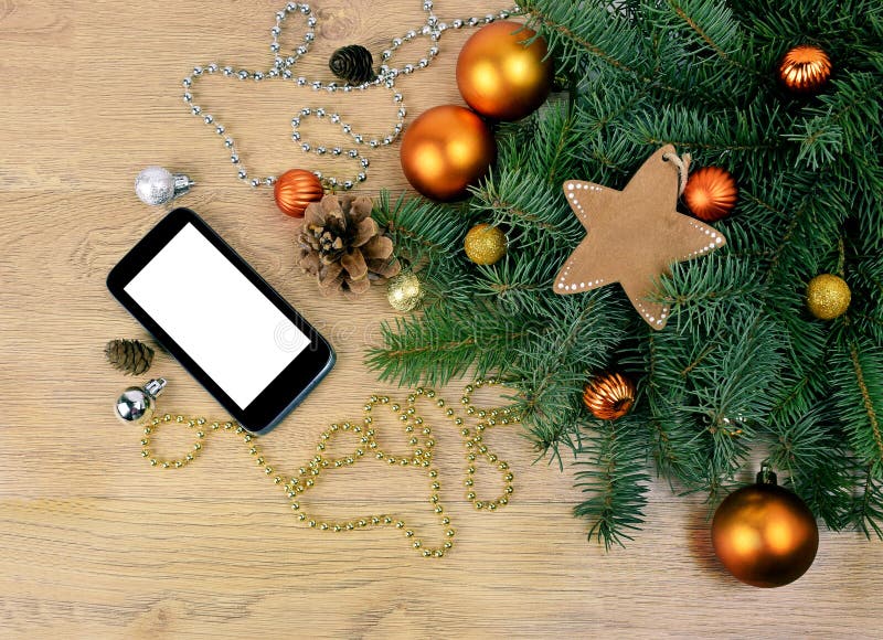 Smartphone Und Weihnachtsbaum Auf Holzernem Hintergrund Weihnachten Gr Stockbild Bild Von Weihnachten Weihnachtsbaum 77564883