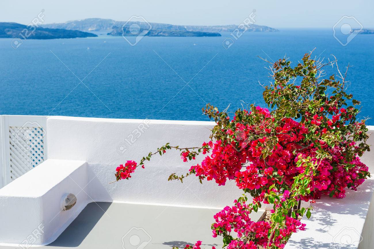Terrasse Mit Roten Blumen Insel Santorin Griechenland Schone Landschaft Mit Blick Aufs Meer Lizenzfreie Fotos Bilder Und Stock Fotografie Image 45182473