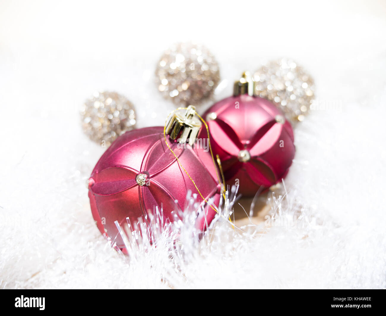 Schone Nahaufnahme Foto Von Rot Gold Und Silber Weihnachtsverzierungen Festlegung Auf Weiss Schimmernden Girlande Machen Einen Tollen Urlaub Hintergrundbild Stockfotografie Alamy